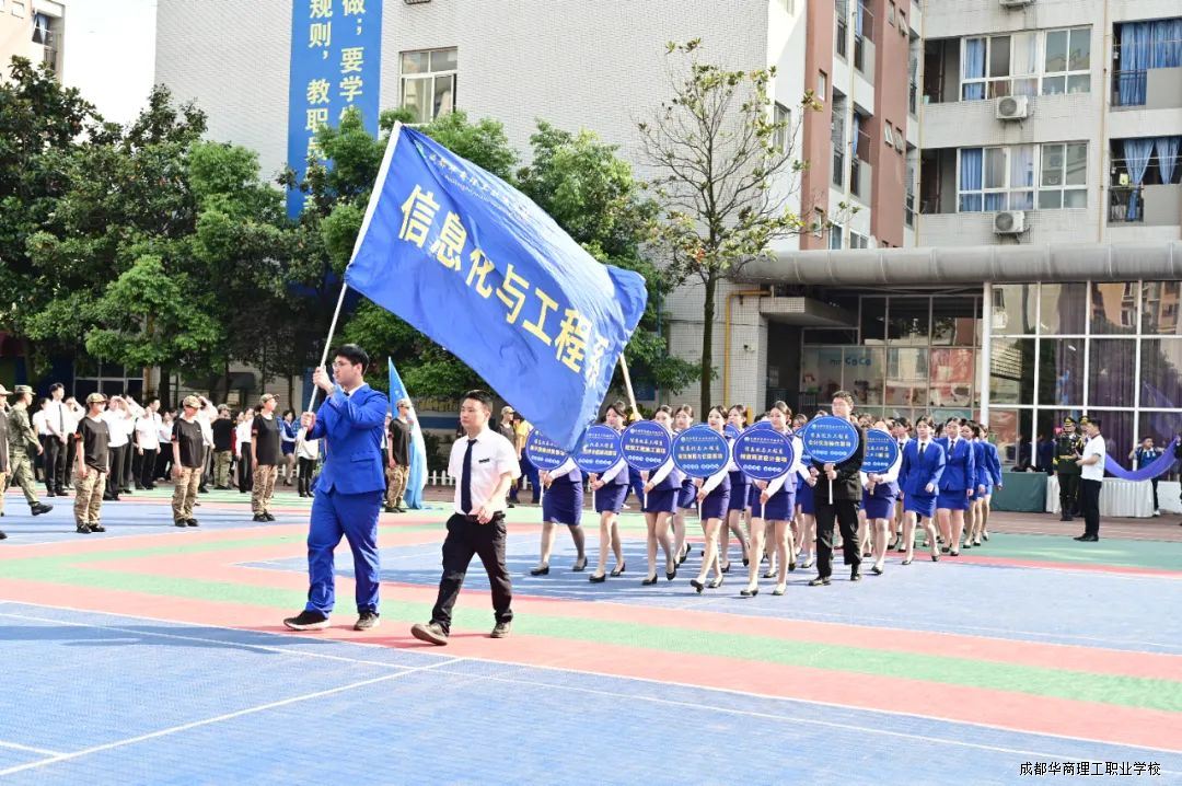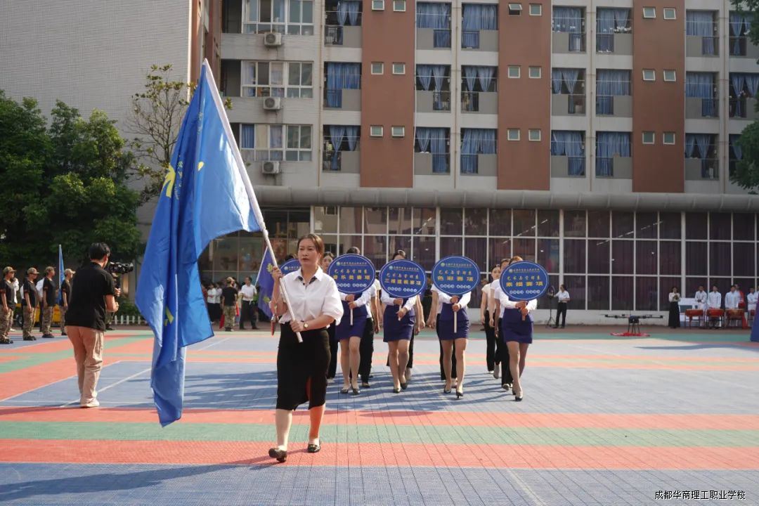 开幕式举行了方队入场仪式:教师方队、后勤方队、小教员方队以及旅游系、艺术与管理系、信息化与工程系、轨道交通系、军事教育应急管理系、综合高中部等各系部方队依次入场,全面展示专业特色和优势教学成效。