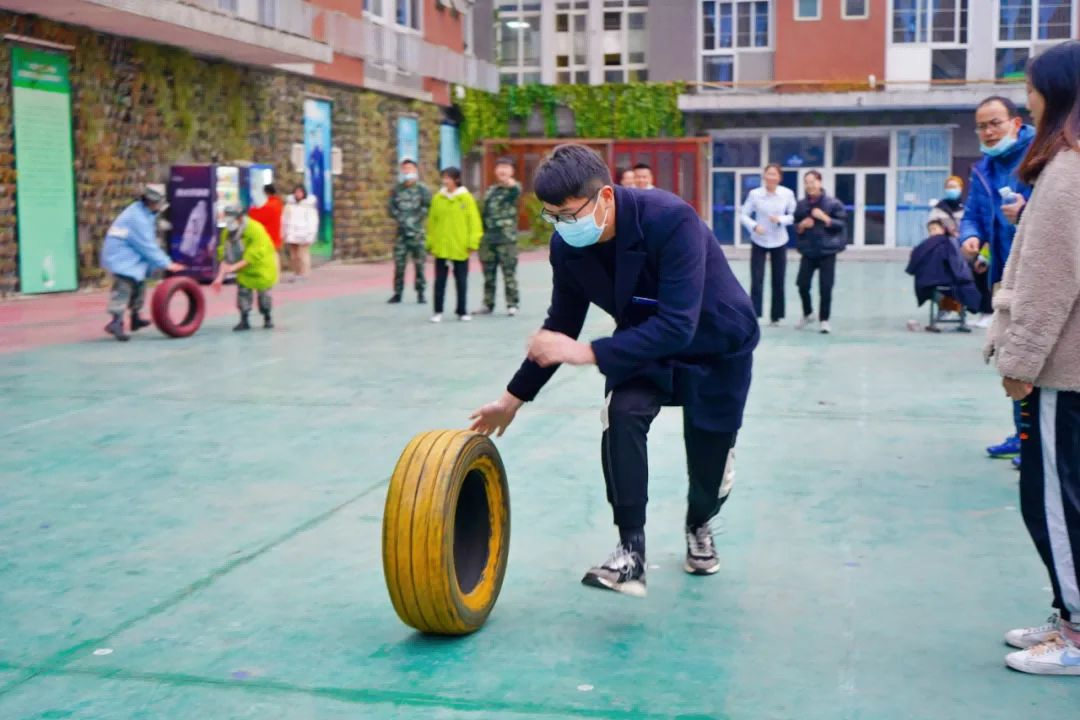 随着一声响亮的口令,10人滚轮胎比赛正式开始。选手们需要一手推着轮胎,另外一只手用来调整轮胎的平衡并做好接力。随着场外同学们一阵阵“加油!加油”的助威声,滚轮胎比赛越来越激烈。