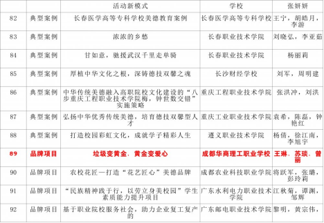 本次案例征集类型分为典型案例、研究成果及品牌项目三类,专家们对通过前期初审而进入本次遴选阶段的案例逐一进行量化打分,坚持公正评审,最终遴选出入围项目164项,推荐项目42项。成都华商理工职业学校申报参评的《垃圾变黄金,黄金变爱心》品牌项目在众多参评成果中脱颖而出,获评2020 中华传统美德典型案例入围项目。