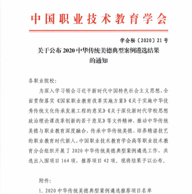 为深入学习领会习近平新时代中国特色社会主义思想,推动中华传统美德与职业教育深度融合,传承中华传统美德、培养精湛技艺的职业教育时代新人,中国职业技术教育学会高等职业技术教育分会组织开展了2020中华传统美德典型案例遴选工作。