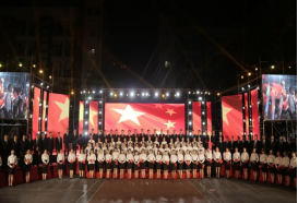 晚19点,鲜艳的五星红旗在国旗护卫队的守护下出场,全体师生起立注视国旗,共唱国歌。