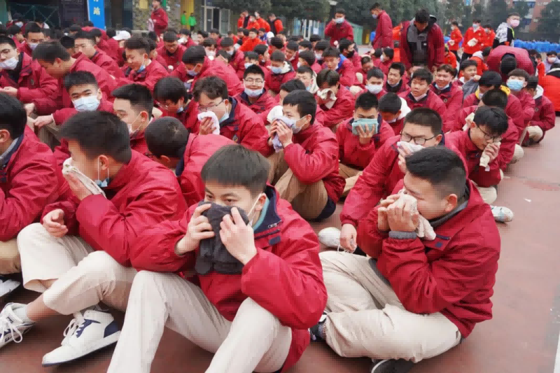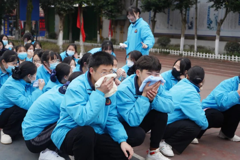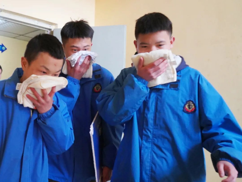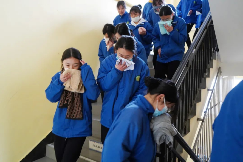 (2)居住本楼层的老师在敲击学生房门后在保护好自己的同时最好快速到达楼梯口,指挥学生使用润湿的毛巾或衣服掩住口鼻弯腰、低姿式匍匐前进的方式迅速逃生,逃生演练时间90-180秒。