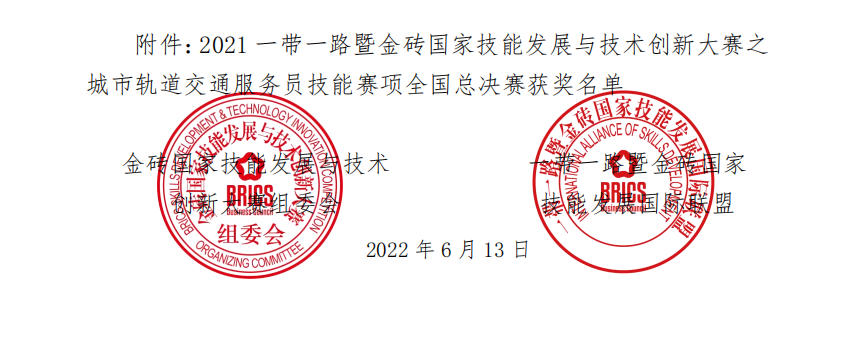 热烈祝贺成都华商理工职业学校参赛队伍在2021一带一路暨金砖国家技能发展与技术创新大赛城市轨道交通服务员技能赛项全国总决赛B模块获得全国三等奖。四川省仅三所学校入围二等奖与三等奖。