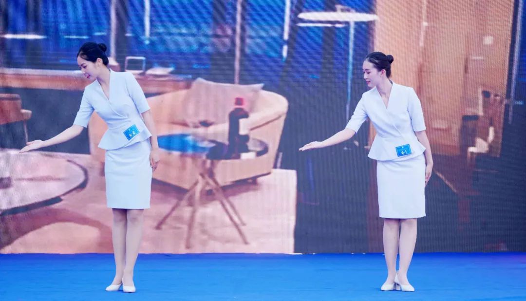 在指定操和创编操展示环节中参赛选手着装整洁大方,动作规范、节奏到位,分别展示了微笑、站姿、蹲姿、坐姿、走姿、握手、引领等礼仪技能,各参赛队伍端庄的仪态、优雅的举止、得体的手势,良好的表现得到了评委们的一致好评。