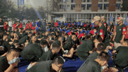 在疏散演练中,同学们听从指挥,用毛巾或衣物捂住口鼻,弯腰靠墙,迅速有序地按照规定路线撤离宿舍,到西区操场集合。