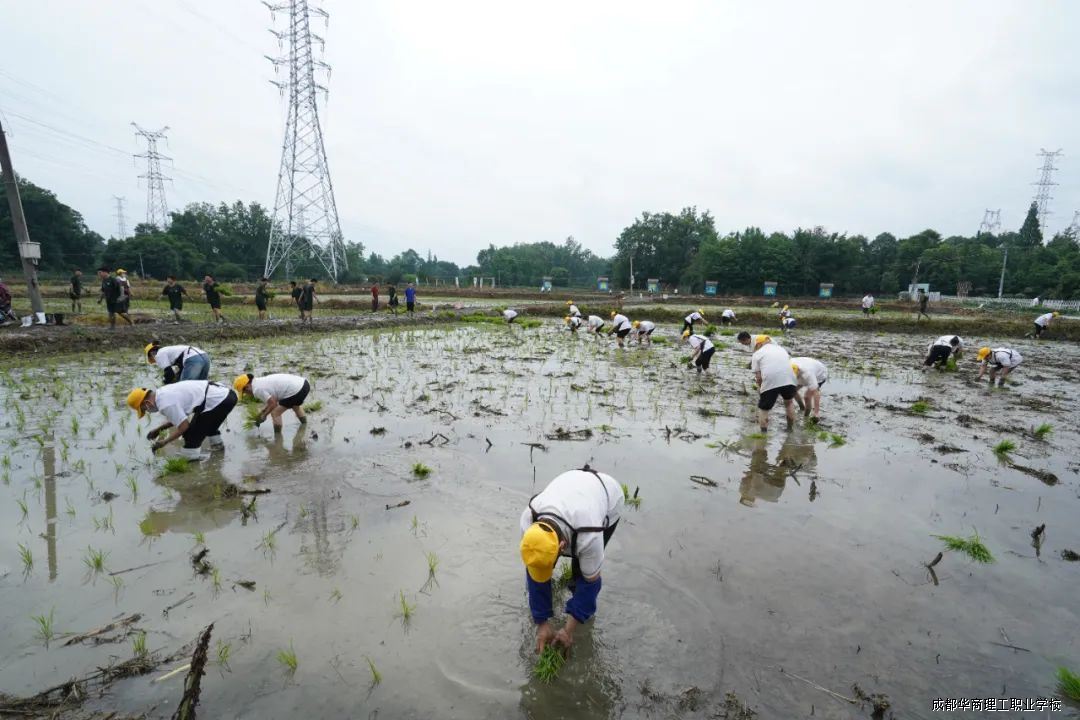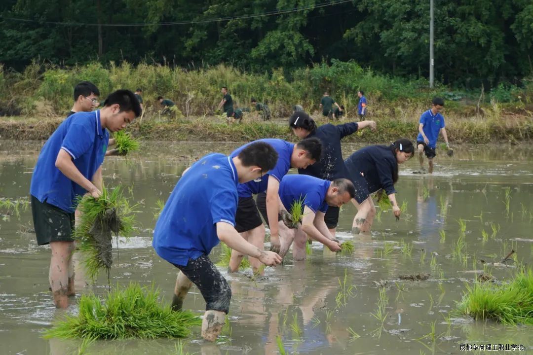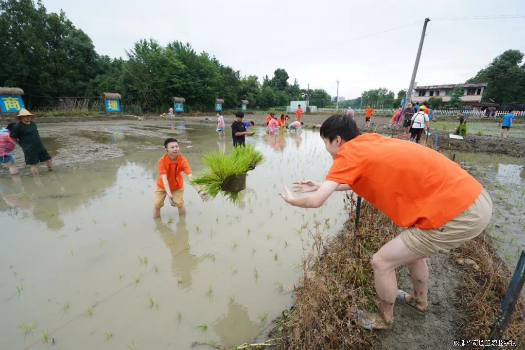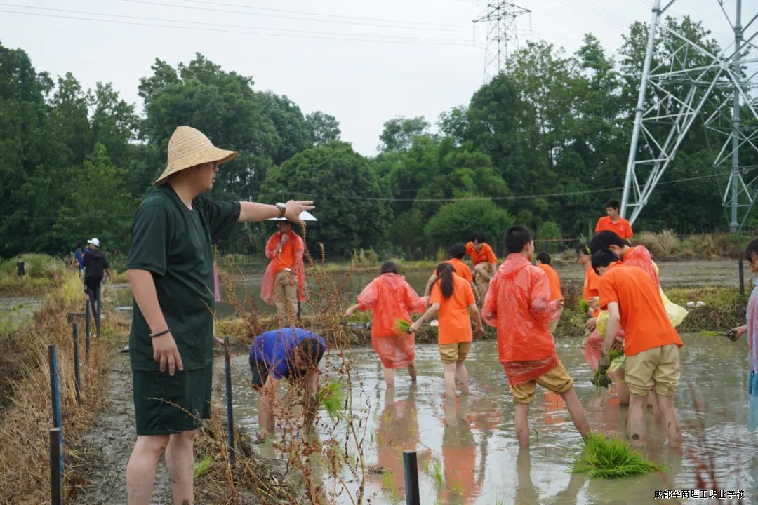 活动现场,党员代表、教师代表与各系学生热情高涨,积极投身农事劳作。老师们凭借丰富种植经验,现场示范讲解插秧要领,从拿苗手法到插秧深度、间距把控,细致入微。随后,大家纷纷脱鞋挽裤、赤脚下田,左手握苗、右手插秧,将一束束秧苗整齐插入水田,田间很快铺满嫩绿。