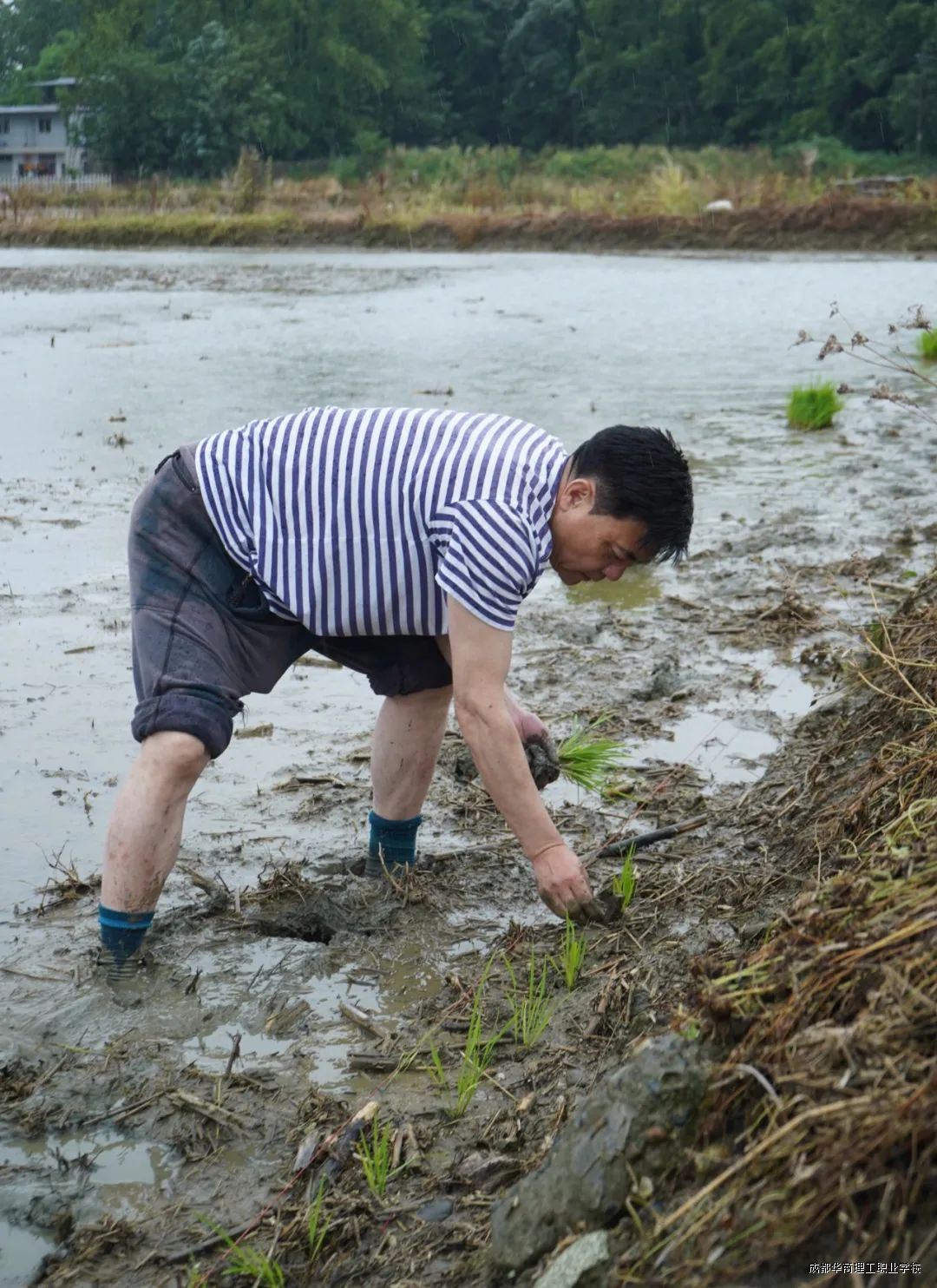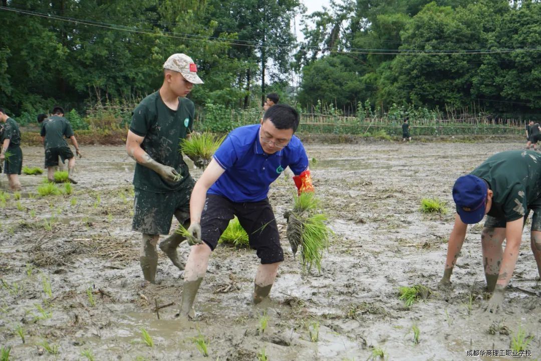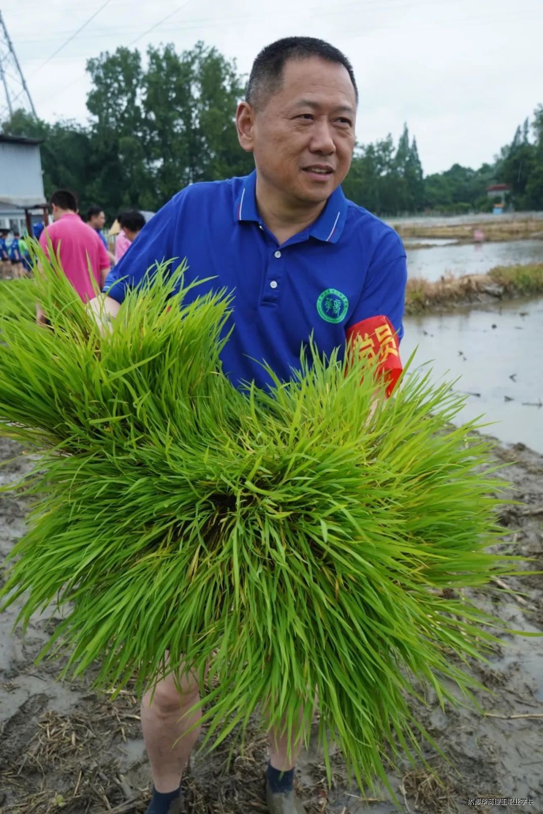 活动现场,党员代表、教师代表与各系学生热情高涨,积极投身农事劳作。老师们凭借丰富种植经验,现场示范讲解插秧要领,从拿苗手法到插秧深度、间距把控,细致入微。随后,大家纷纷脱鞋挽裤、赤脚下田,左手握苗、右手插秧,将一束束秧苗整齐插入水田,田间很快铺满嫩绿。