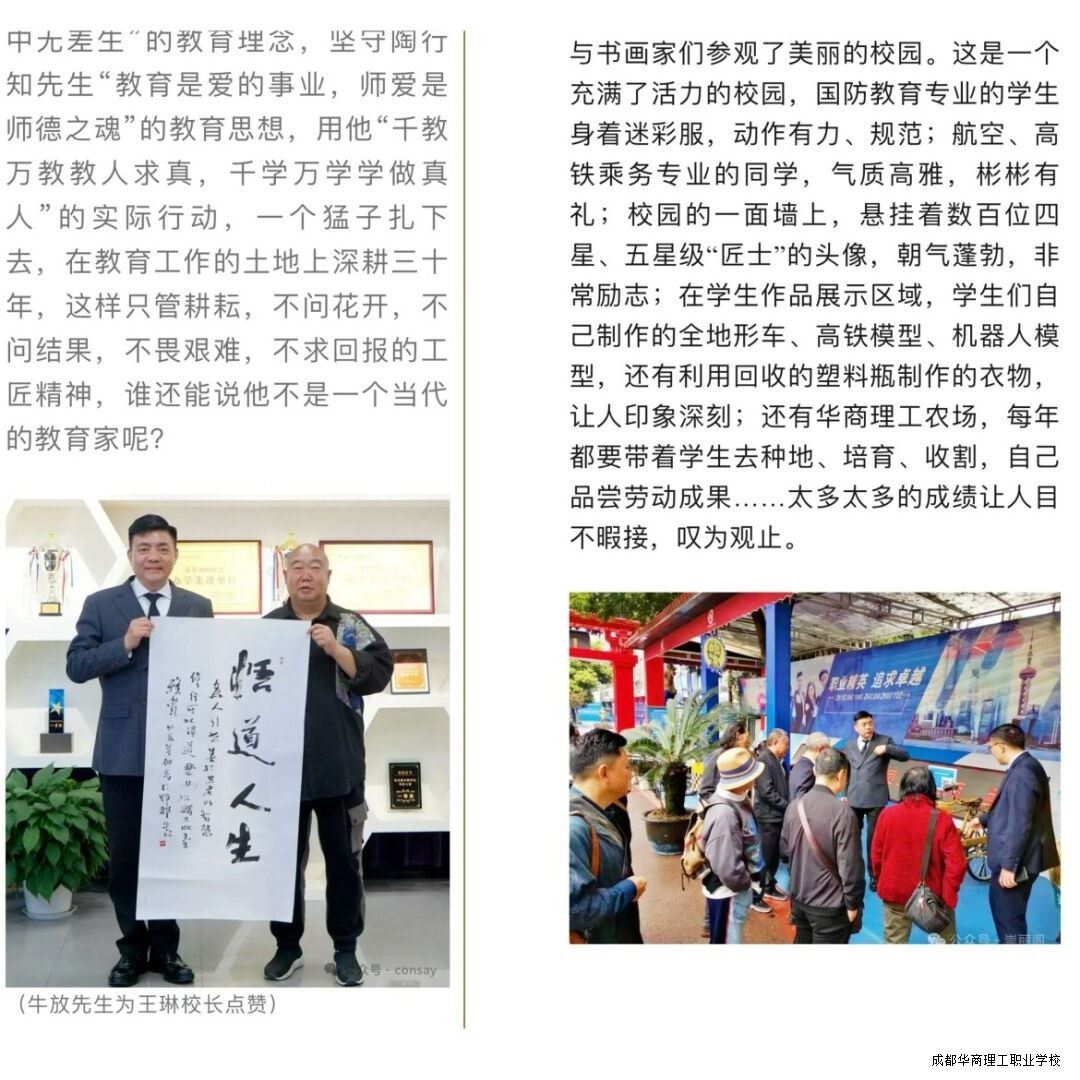近日,省直(红星)作协校园文学专委会众多知名书画家、作家莅临成都华商理工职业学校,开展交流指导工作,并参观学校一日常规。专家们不仅深入了解了学校的日常运行和校园文化,更是现场挥毫泼墨,以笔墨传情,为学校三十周年校庆献上了一份特别的祝福。