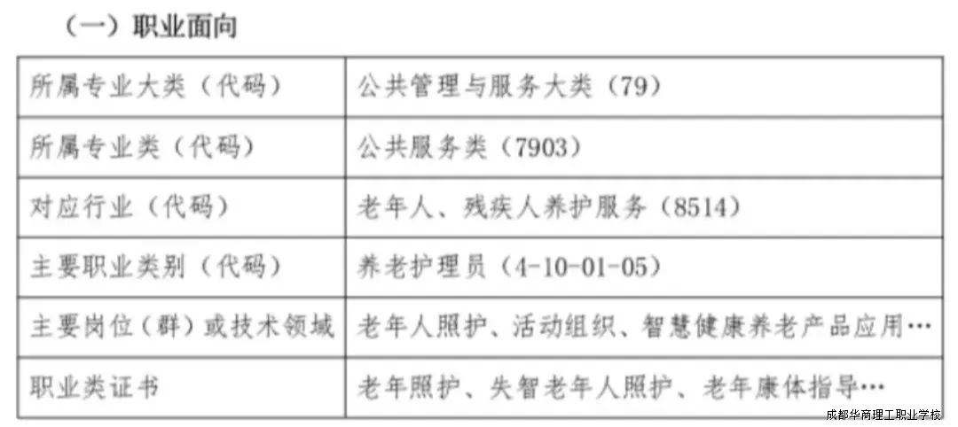 本专业以对接养老健康产业,培养适应区域社会经济发展和现代化智慧康养老需求为目标,培养实践老年照护、康复、医养、管理等技术技能,面向各类养老机构、养老服务企业、老年健康产业等行业领域,培养高素质健康养老技术技能人才。